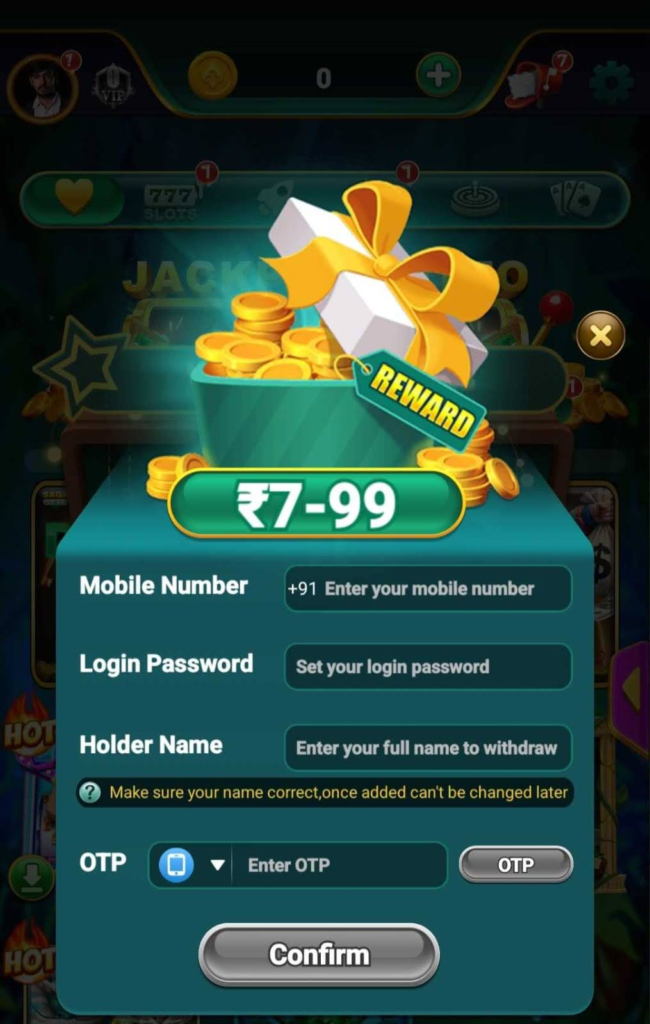 Open the Bet 213 app. Once opened, you will find a registration option on your mobile screen. Enter your mobile number, password, email ID, and account holder name, then click on the ‘OTP’ option. A four-digit OTP will be sent to your mobile number; enter this code to verify your account. Upon successful registration, you will receive a bonus of ₹200. You can use this bonus amount to play games and win real cash.